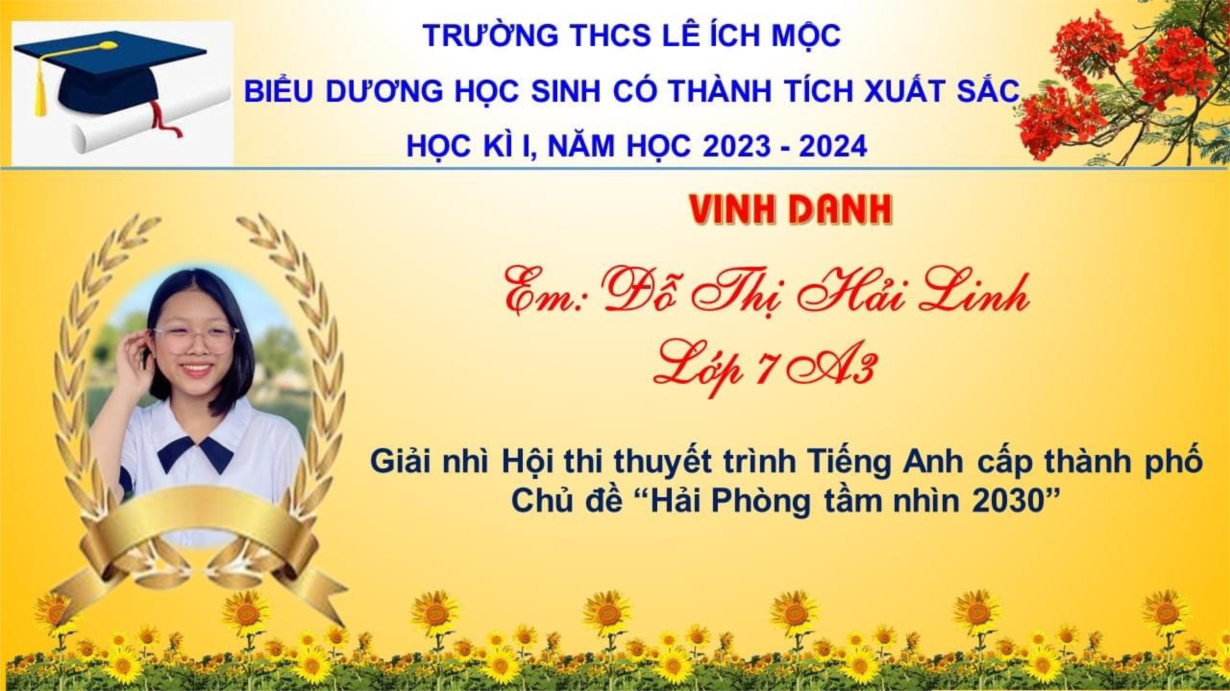 Chúc mừng em Đỗ Thị Hải Linh - học sinh lớp 7A3 đã xuất sắc đạt giải nhì Hội thi thuyết trình tiếng Anh với chủ đề "Hải Phòng tầm nhìn 2030" do Thành Đoàn - Sở Giáo dục và Đào tạo - Sở Ngoại Vụ phối hợp tổ chức.