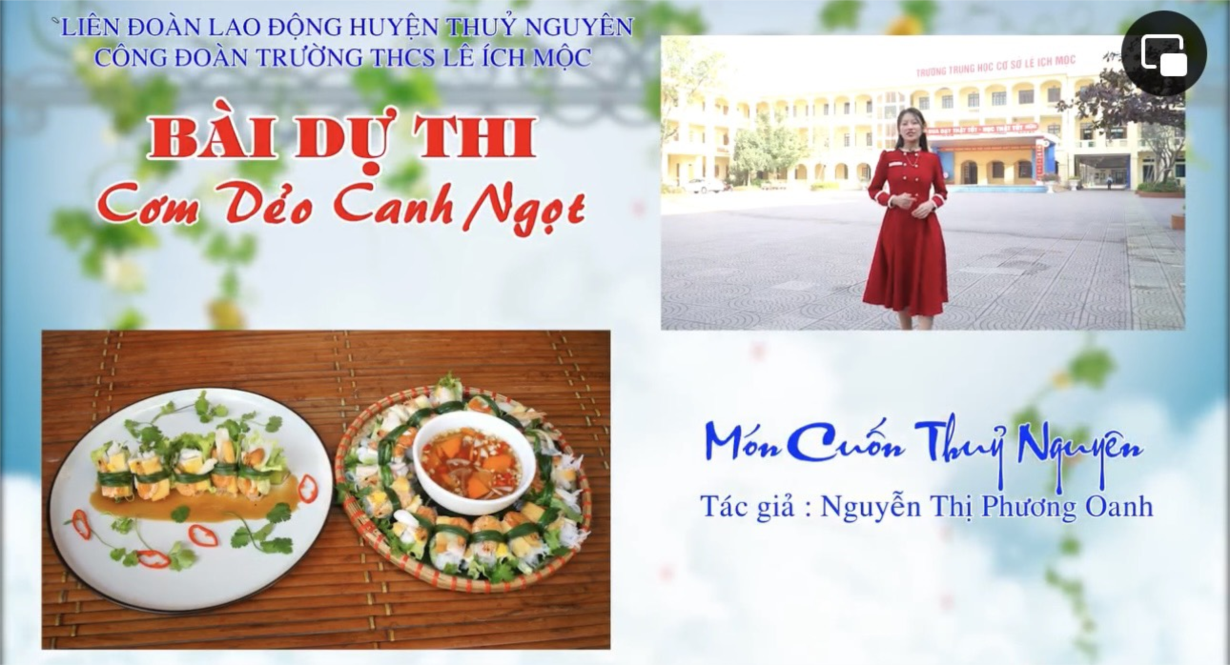 Chúc mừng cô giáo trẻ xinh đẹp, duyên dáng và đảm đang của Công đoàn THCS Lê Ích Mộc, huyện Thủy Nguyên, thành phố Hải Phòng đã thổi linh hồn tươi mới vào một món ăn truyền thống mang đậm bản sắc quê hương: Món cuốn Thuỷ Nguyên. Nếu thích phong cách Âu, chúng ta có thể thưởng thức món cuốn cùng nước sốt tùy khẩu vị của từng người.👍