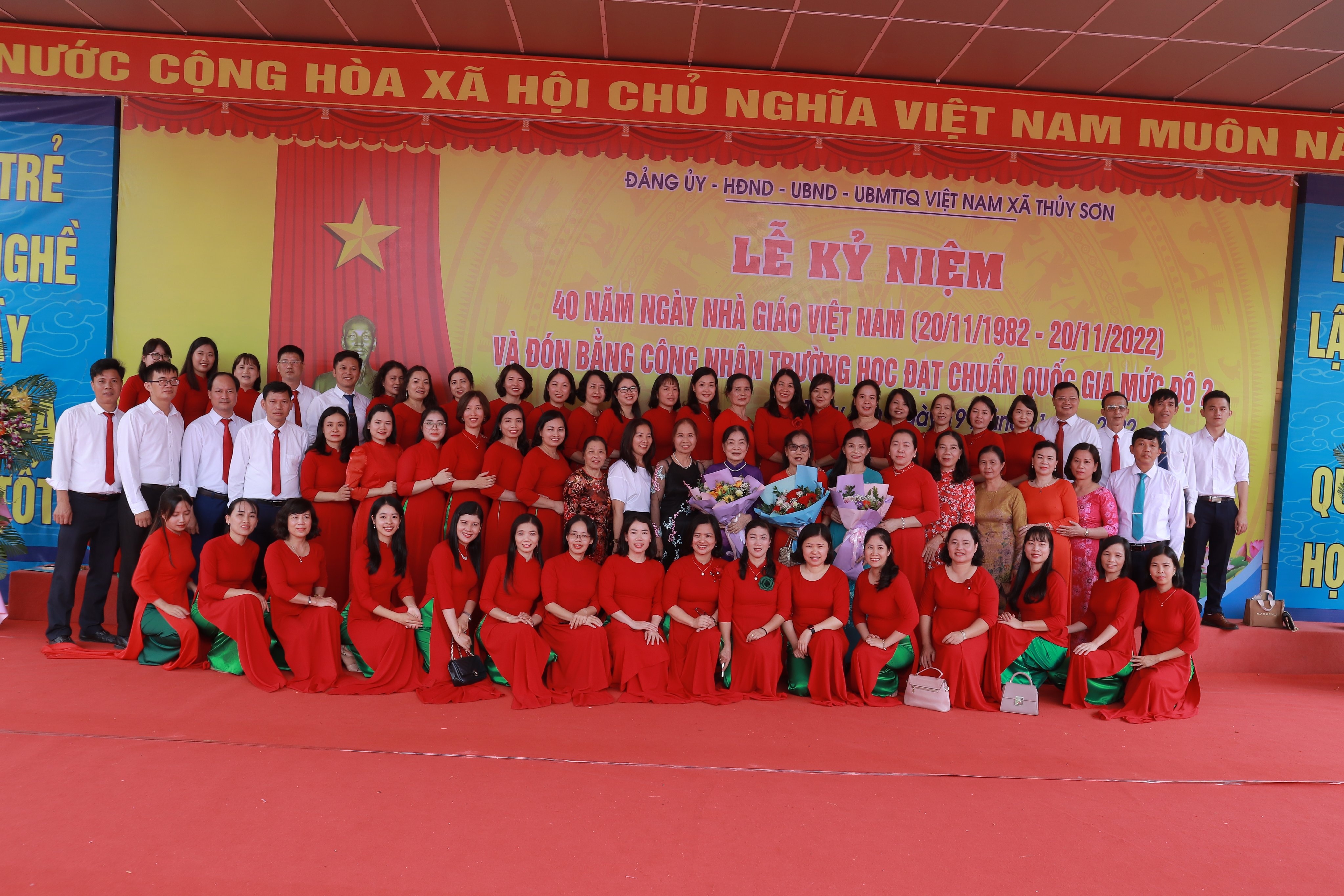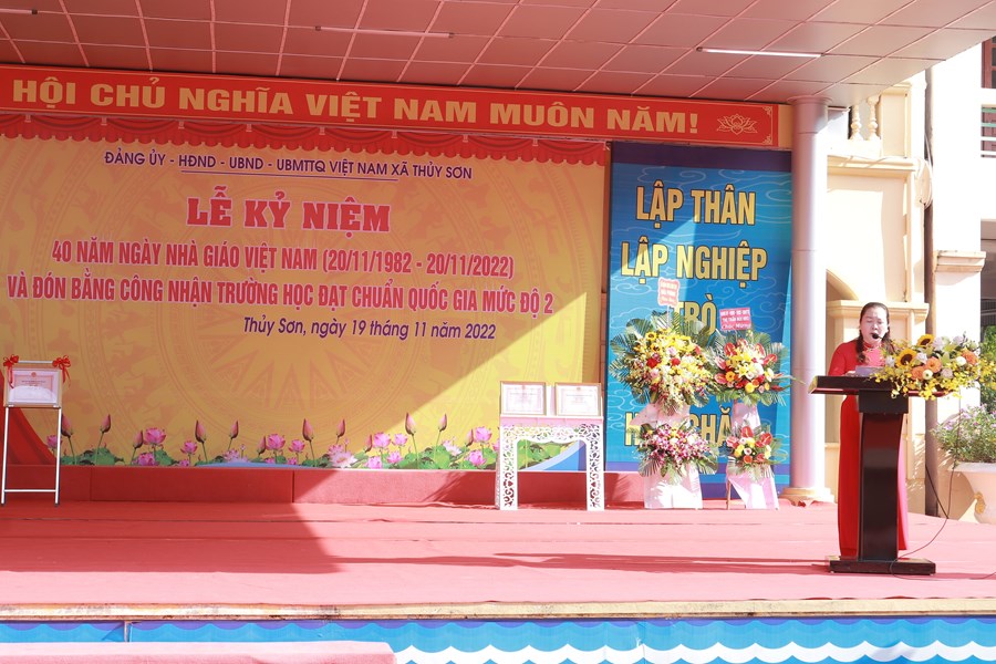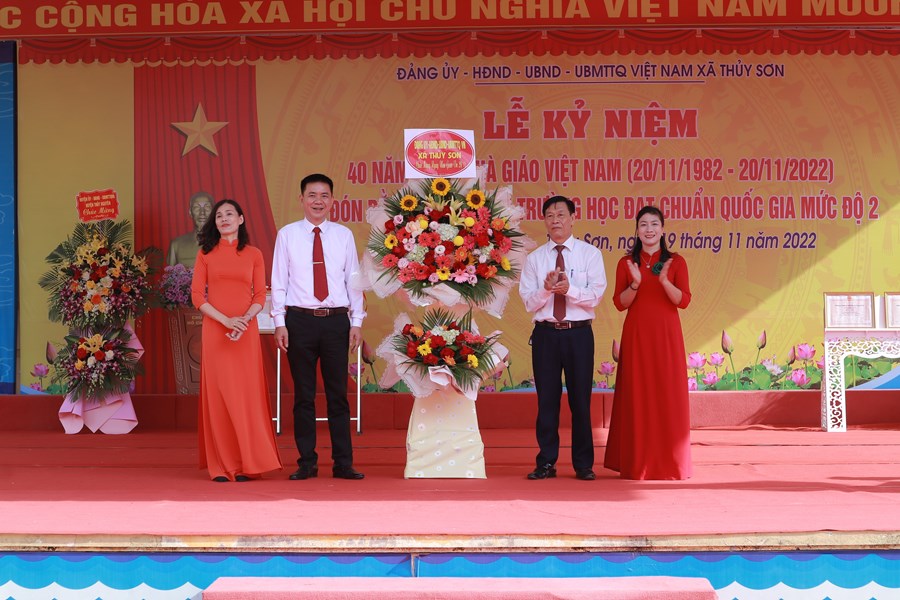 Tại lễ kỷ niệm, các đồng chí Nguyễn Thành Lung, đồng chí Bùi Khánh Toàn tặng hoa chúc mừng trường MN Thủy Sơn, trường THCS Lê Ích Mộc nhân dịp đón bằng công nhận trường học đạt chuẩn quốc gia mức độ 2. Trong không khí vui mừng của buổi lễ, đồng chí Lê Thị Mai- chủ tịch UBND xã Thủy Sơn đọc diễn văn ôn lại truyền thống 40 năm ngày Nhà giáo Việt Nam. Phát biểu tại lễ kỷ niệm, đồng chí Nguyễn Thành Lung gửi lời chúc mừng tới các nhà trường. Tại buổi lễ, thừa ủy quyền của UBND thành phố, đồng chí đã trao bằng công nhận trường học đạt chuẩn quốc gia mức độ 2 cho 2 trường Mầm non Thủy Sơn và trường THCS Lê Ích Mộc. Đồng chí Bùi Khánh Toàn trao bằng công nhận kiểm định chất lượng giáo dục cấp độ 3. Nhân dịp này để ghi nhận thành tích của các nhà trường, Đảng ủy HĐND, UBND, UBMT TQVN xã Thủy Sơn đã tặng thưởng các nhà trường được chính phủ, UBND thành phố, huyện ủy UBND huyện khen thưởng và các cá nhân tiêu biểu được UBND thành phố khen thưởng, đạt danh hiệu chiến sĩ thi đua cơ sở, lao động tiên tiến. Xã Thủy Sơn tặng hoa cho các đồng chí nguyên là hiệu trưởng của các nhà trường thay cho lời tri ân của địa phương đối với sự cống hiến vì sự nghiệp giáo dục của các nhà giáo.