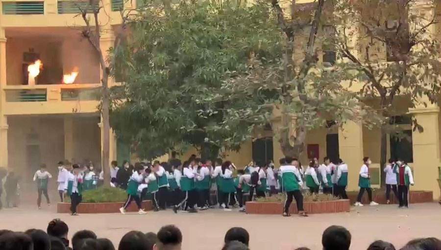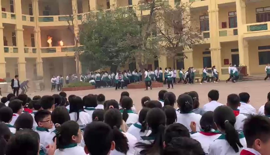 Các em HS còn được tham gia thực hiện cách thoát hiểm khi có cháy xảy ra trong trường học.