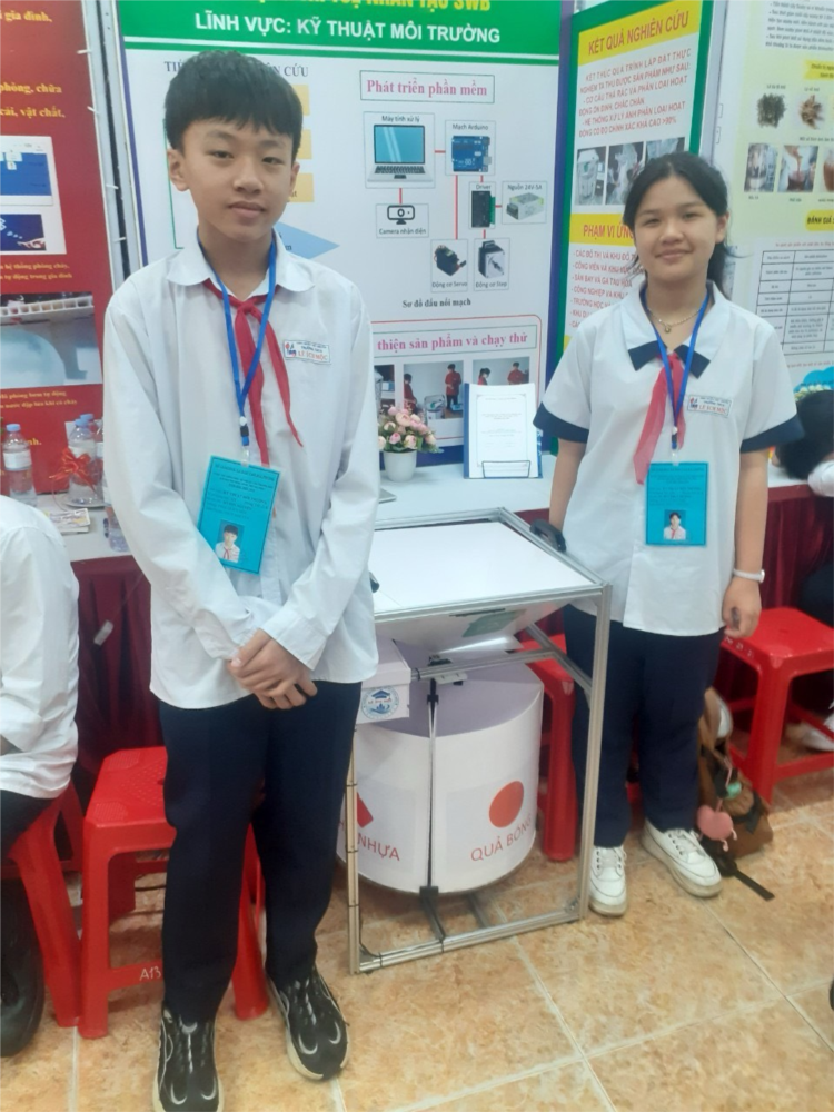 Trường THCS Lê Ích Mộc tham gia với sản phẩm "Thùng rác thông minh phân loại rác ứng dụng trí tuệ nhân tạo SWB" lĩnh vực Kỹ thuật môi trường của em Bùi Thuỳ Dương - Học sinh lớp 9A2 và em Đỗ Sơn Nguyên - Học sinh lớp 8A1 dưới sự hướng dẫn của Thầy giáo Nguyễn Văn Hạnh - Giáo viên Tổ KHTN.
