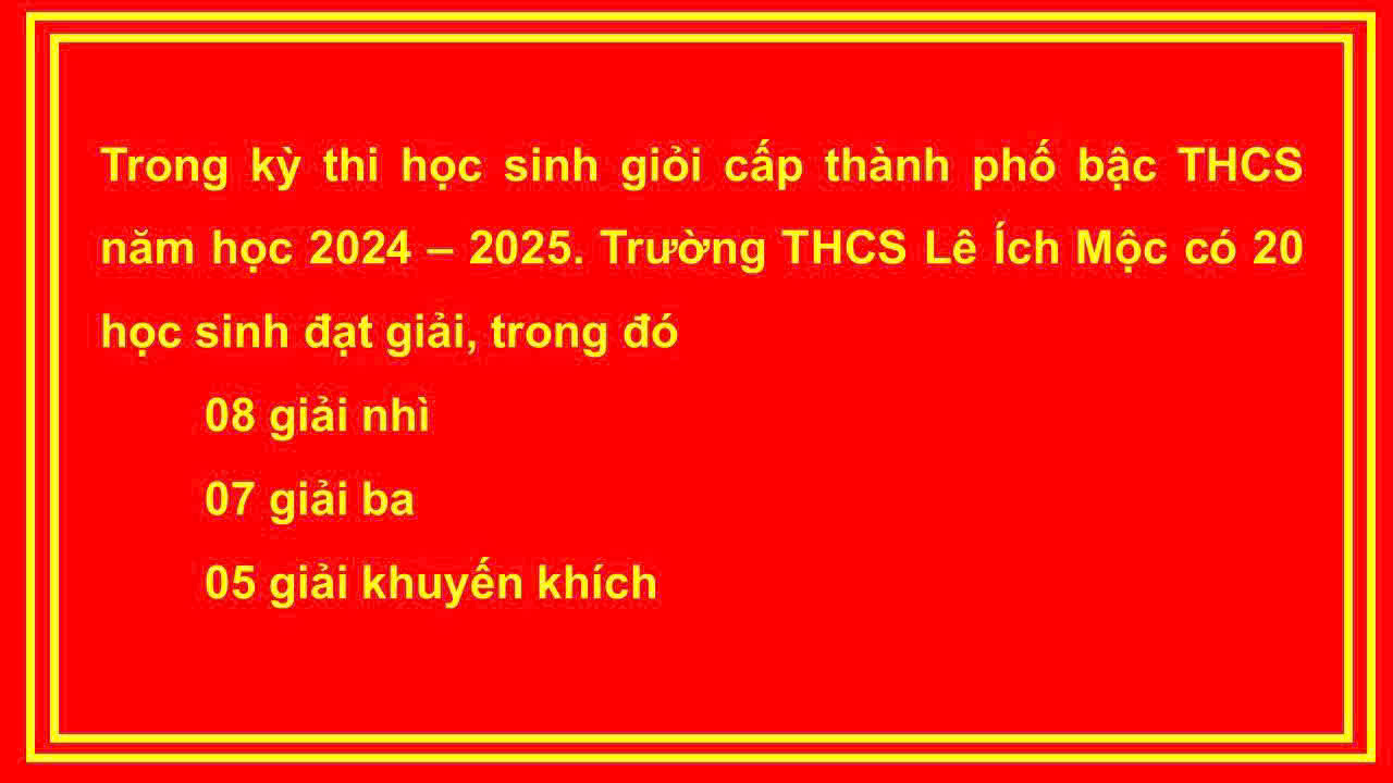 Với tổng số 20 giải, bao gồm 8 giải Nhì, 7 giải Ba và 5 giải Khuyến khích, các em học sinh trường Lê Ích Mộc đã thể hiện tài năng xuất sắc và sự nỗ lực không ngừng nghỉ trong quá trình học tập. Thành tích này không chỉ là niềm tự hào của nhà trường mà còn là minh chứng rõ nét cho chất lượng đào tạo và sự quan tâm đầu tư của thầy cô giáo đối với học sinh.